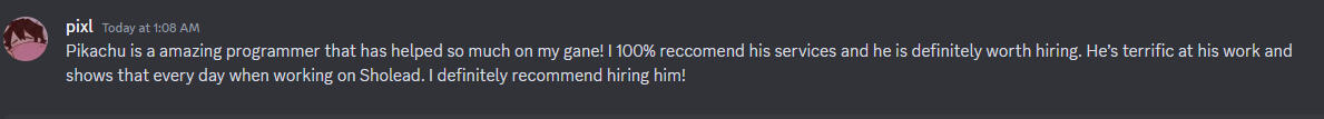 My name is Pikachu, and I'm a Roblox scripter. I started programming as a whole in 2016. Over the past 5 years, I've had many opportunities that have helped me build my knowledge and understanding up to what it is now. People that have helped me include: TheDevKing, AlvinBlox and B Ricey.